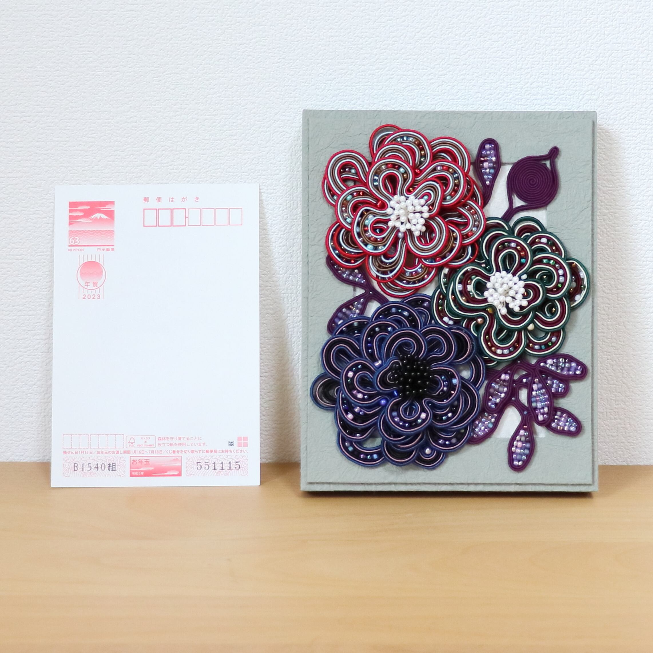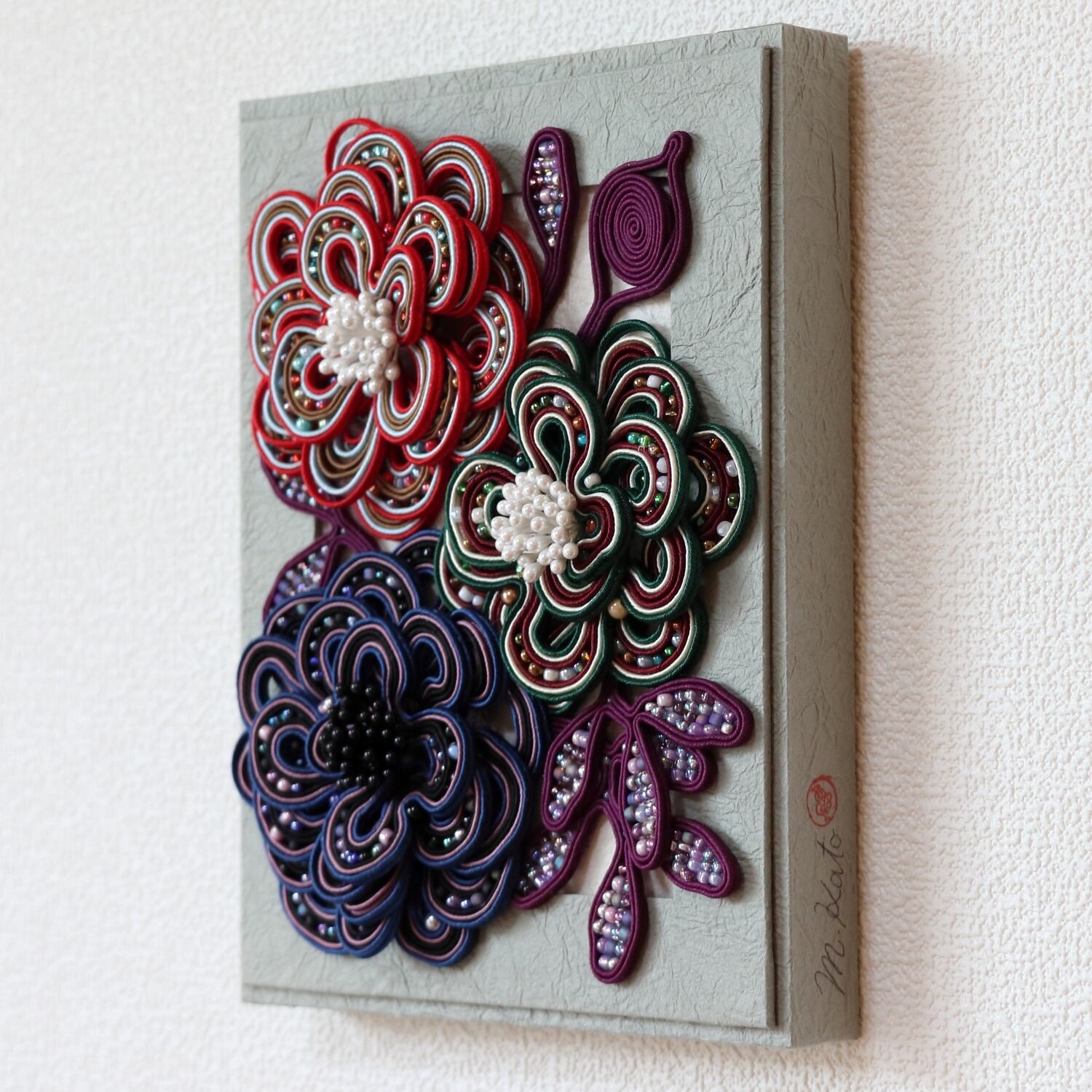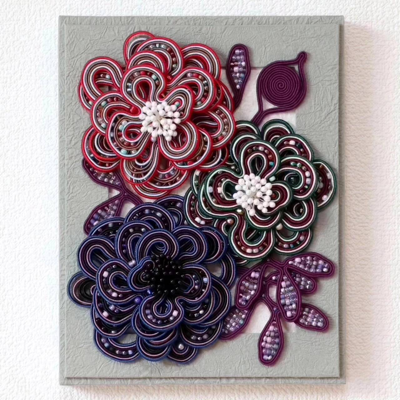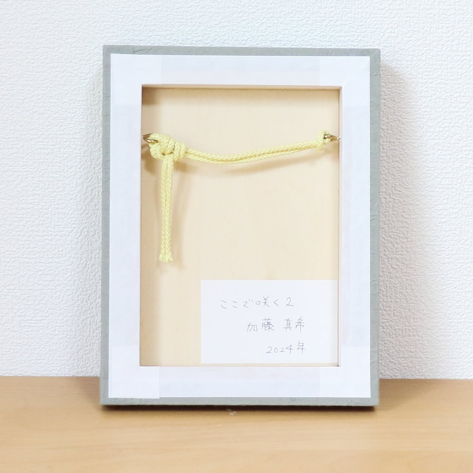花びらのボリューム感や額縁との重なり合いで、ようやく「半立体作品」としての奥行きの強みを生かせるようになった気がします。
