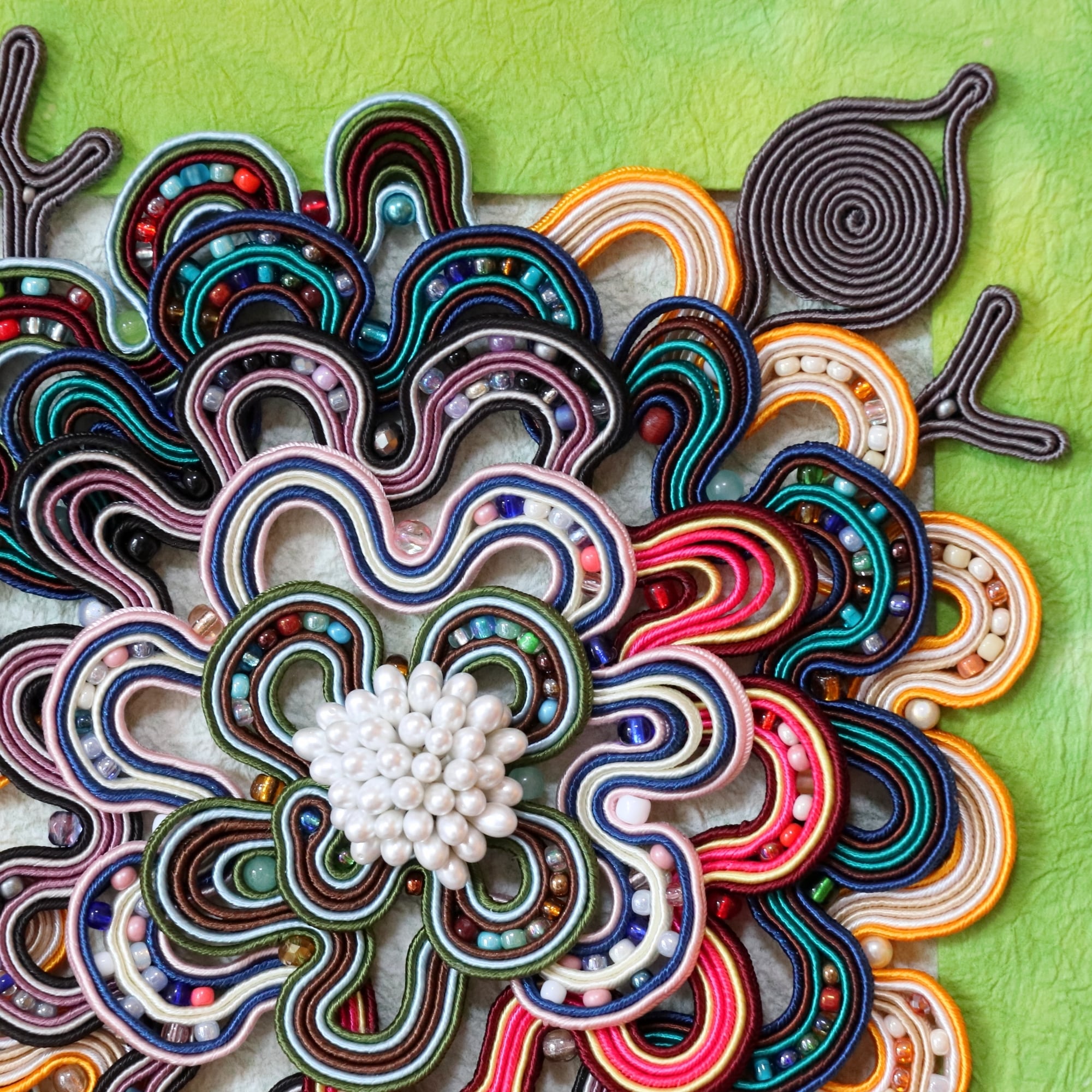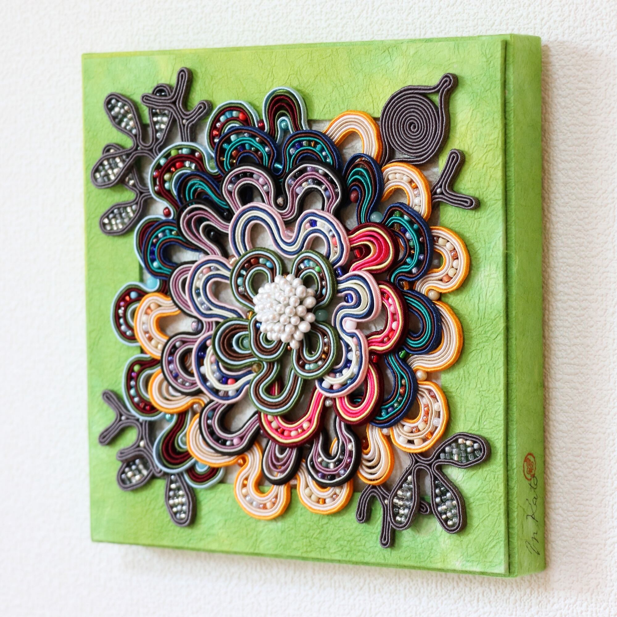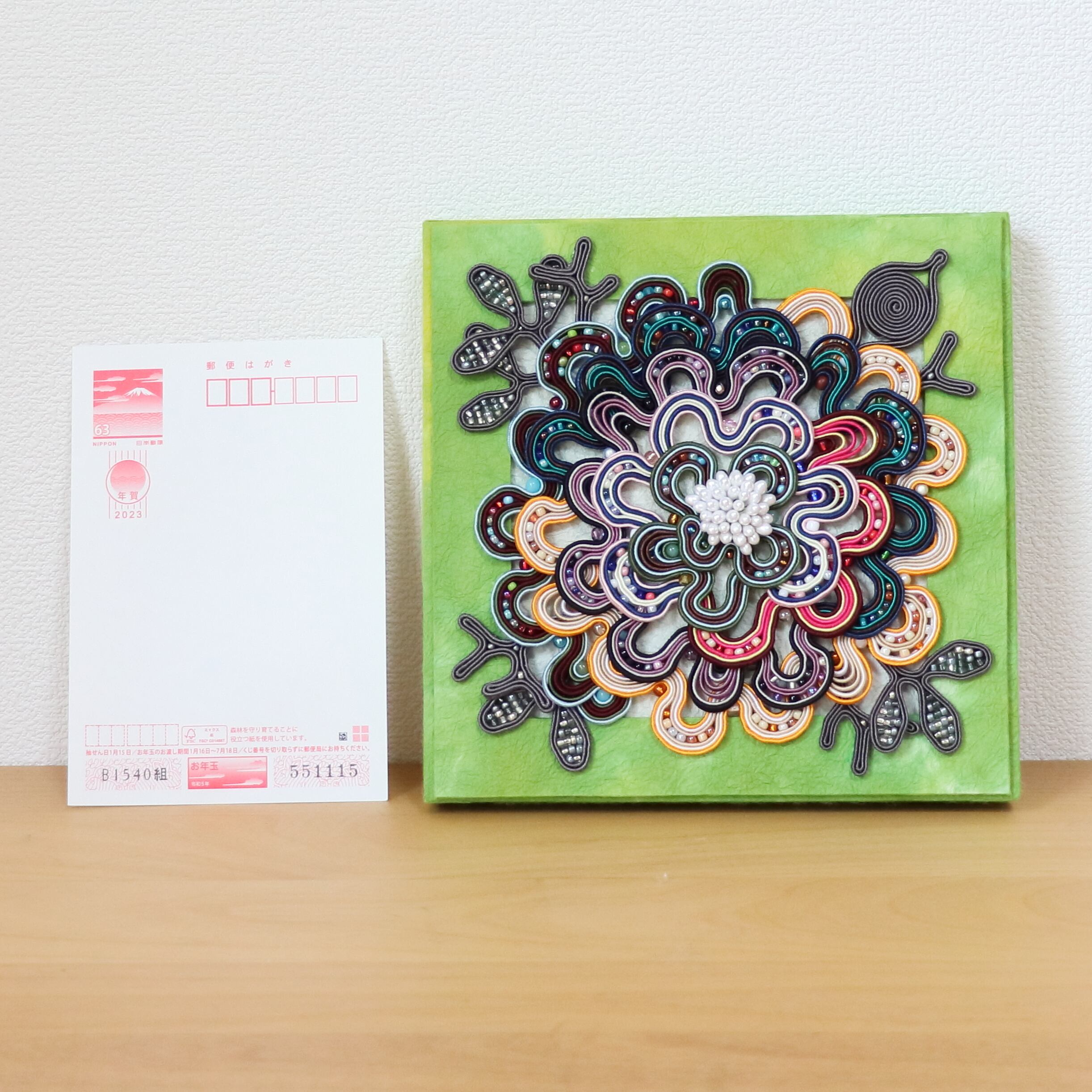 素材 レーヨン製コード、ビーズ、糸、ペップ、厚紙、和紙、木製パネル