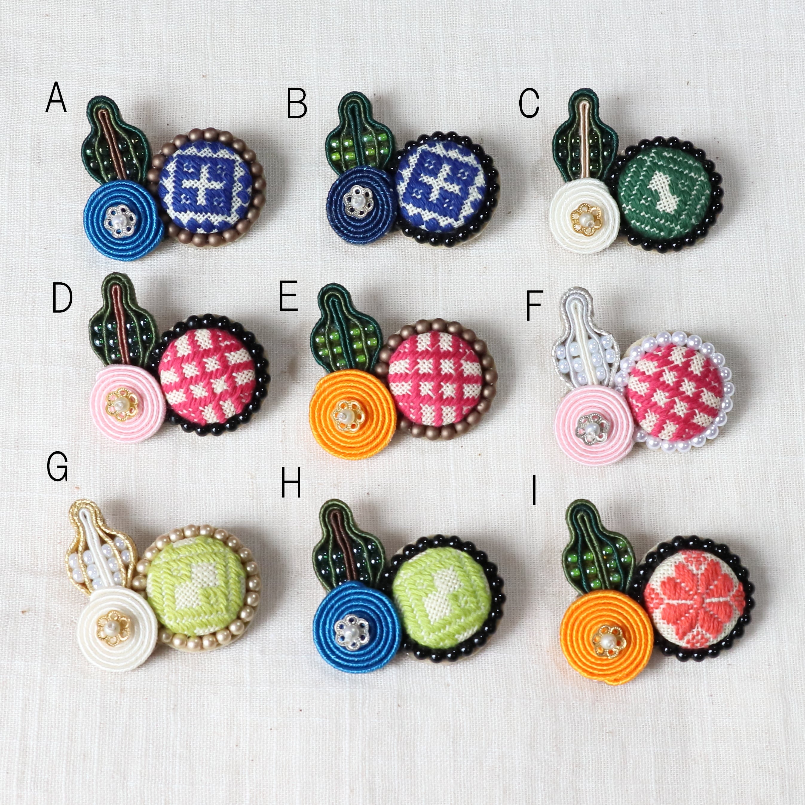 小さなお花と葉っぱを添えて、品の良いブローチに仕立てました。いずれも縁起の良い柄を選んでいただき、持つ方の幸せを願っています。